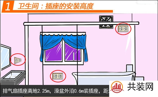 1、插座的安裝位置 有外窗時,應(yīng)在外窗旁預(yù)留排氣扇接線盒或插座,由于排氣風(fēng)道一般在淋浴區(qū)或澡盆附近,所以接線盒或插座應(yīng)距地面2.25m以上安裝。距淋浴區(qū)或澡盆外沿0.6m外預(yù)留電熱水器插座和潔身器用電源插座。在盥洗臺鏡旁設(shè)置美容用和剃須用電源插座,距地面1.5m~1.6m安裝。