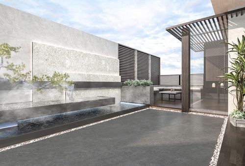 客廳 A+CZH20290180XL迪拜灰 自然風(fēng)的核心是追求材質(zhì)的天然美感,是材質(zhì)系的極簡(jiǎn)主義,深灰色的墻面令人印象深刻,現(xiàn)代風(fēng)休閑桌椅與黑色精細(xì)金屬框架,組合出剛硬而精致的空間質(zhì)感;同時(shí)強(qiáng)調(diào)空間的通透感,通過(guò)半開(kāi)放鐵架與庭院相連接,與自然陽(yáng)光綠植同呼吸。