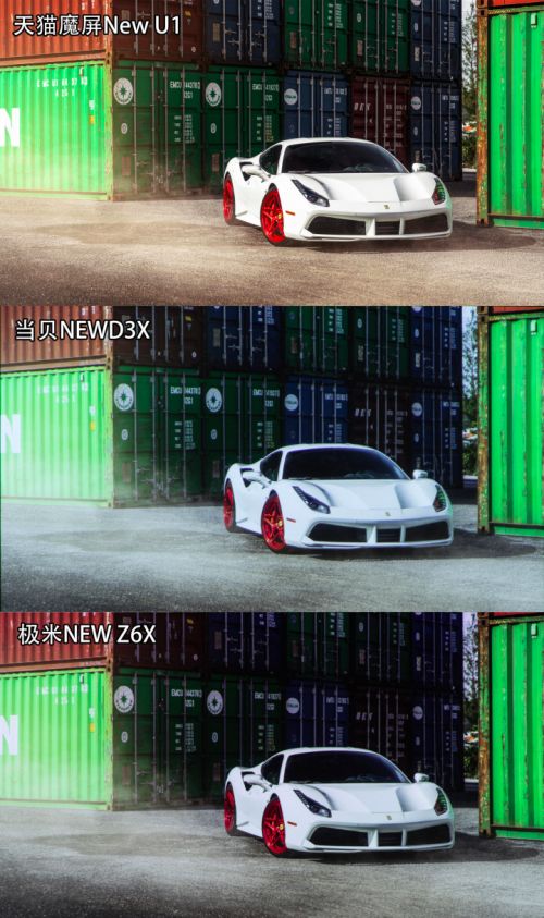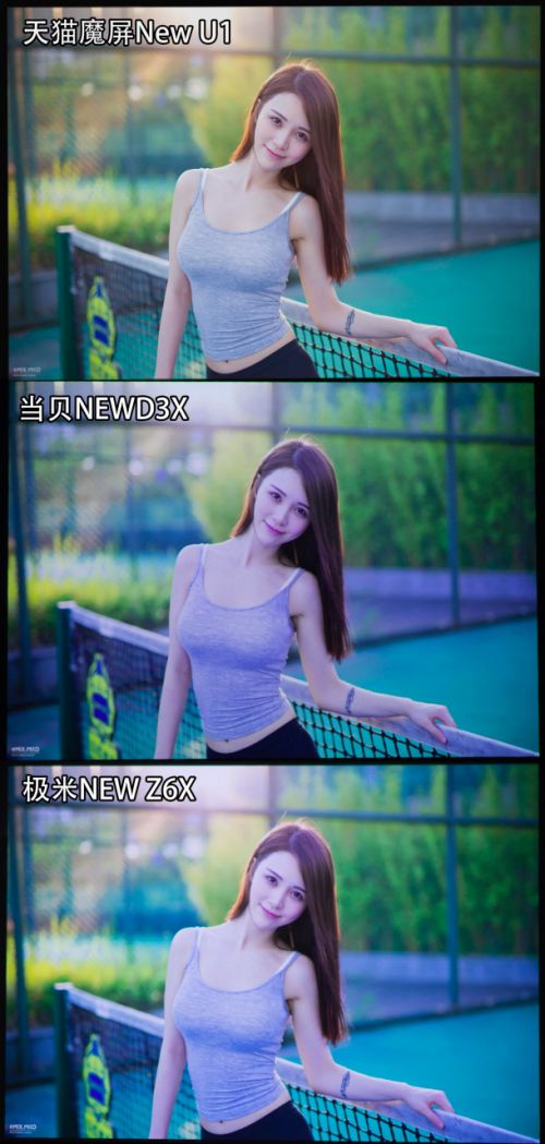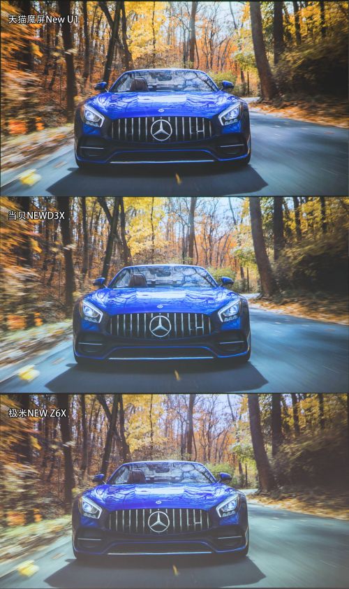 從上圖中幾款投影儀的投放畫面來看,天貓魔屏New U1的色彩偏暖,也比較明亮,畫面中沒有出現(xiàn)虛化的現(xiàn)象,邊角也沒有出現(xiàn)太大的變形狀況。極米NEW Z6X和當(dāng)貝NEW D3X色調(diào)則要偏冷一些。