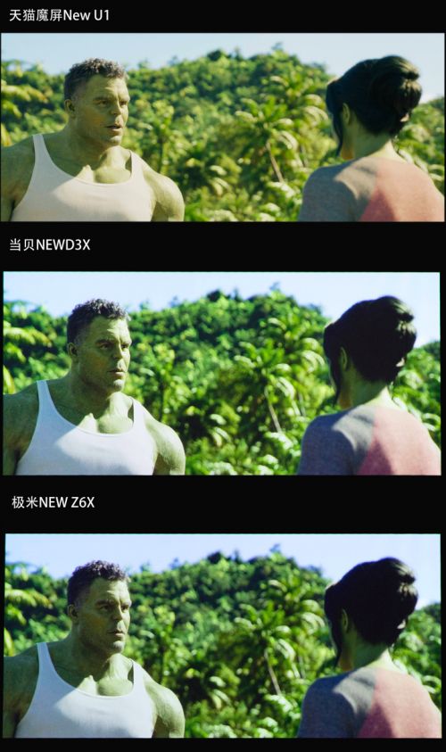 在觀影體驗方面,我選取的測試片源為4K級別的一個劇集《女浩克》,使用這三款機(jī)器在同一環(huán)境(夜晚未開燈、全暗環(huán)境)下做了播放測試,它們雖然是1080P分辨率的機(jī)器,但是在解析4K資源時還是挺給力的。 從上圖所呈現(xiàn)出的成像效果來看,天貓魔屏New U1的成像很明亮,而且畫面中遠(yuǎn)處的樹木在色彩過度方面的表現(xiàn)更到位,人物輪廓清晰可見。極米NEW Z6X和當(dāng)貝NEW D3X色調(diào)依然更偏冷色調(diào)一些。