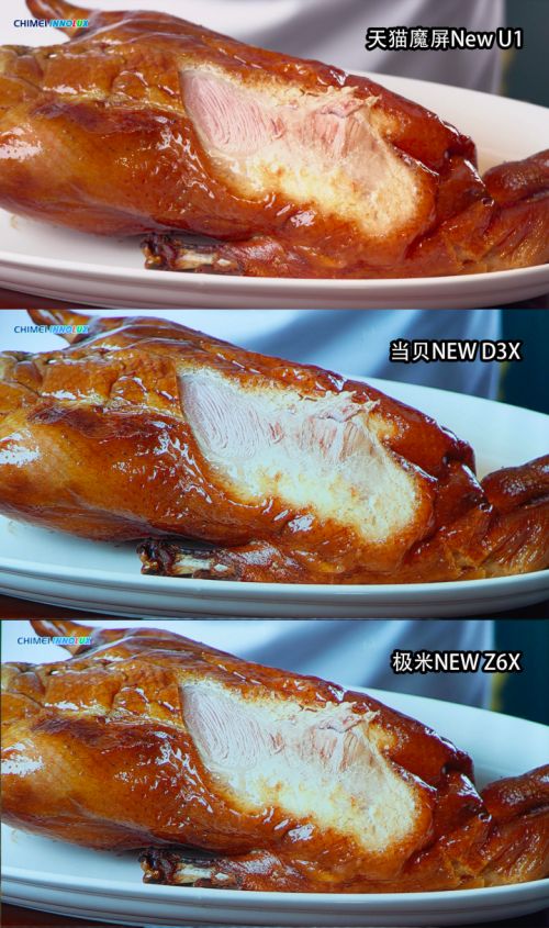 此外,我還選取了比較經(jīng)典的一個4K片源做了另一個測試,使用相機(jī)實拍了其中的一組美食鏡頭。從上面這組對比圖中,我們可以看到它們對美食畫面的表現(xiàn)也是特別到位的,尤其是肉質(zhì)的紋理特別清晰細(xì)膩。尤其是天貓魔屏New U1,食物看起來非常地誘人。 4.觀影流暢度