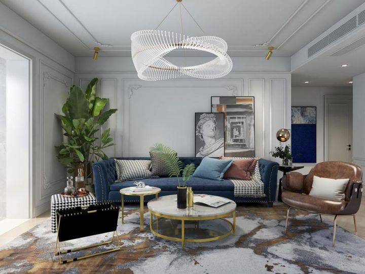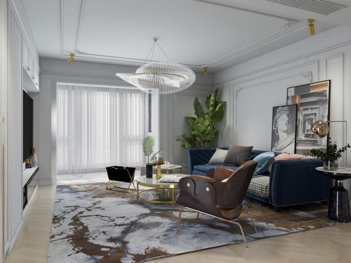 這套案例中設(shè)計(jì)師大量融入了法式風(fēng)格的設(shè)計(jì)元素,沙發(fā)背景墻的雕花線條,配上黃銅水晶吊頂燈的映襯,奢華大理石花紋地毯與深色皮質(zhì)沙發(fā)的搭配,共同營造出復(fù)古且充滿韻味的空間。