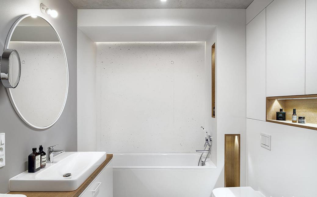 白色和淺灰色的搭配使得整個空間風(fēng)格分明又相互協(xié)調(diào),給人一種和諧質(zhì)感。白色基調(diào)下,加入金色元素,圓形鏡面相比方形更顯精致,也更為適合整體風(fēng)格。