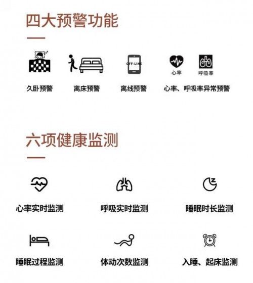 ??360°呵護模式:四大預警、六大健康監(jiān)測 ??誼瑞“菁選-破曉”智能真皮電動床,不單是讓你睡得快,睡得好,更加能讓你睡得安全,特別是老年人和長期因為壓力亞健康的中年人群,睡眠時間長,如何能夠清晰明了的知道自己夜晚的各項健康指數(shù)成了急需解決的問題,誼瑞“菁選-破曉”智能真皮電動床采用整晚360°監(jiān)測體系,確保睡眠安全: