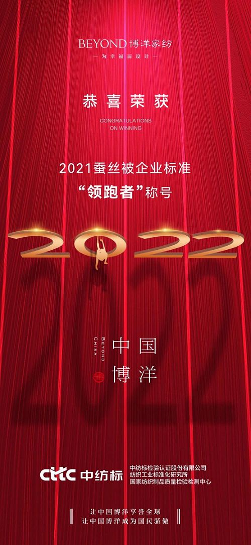 ??近日,國家紡織制品質量監(jiān)督檢驗中心CTTC中紡標公布2021蠶絲被企業(yè)標準“領跑者”名單。憑借遠高于國家標準的產(chǎn)品質量,博洋家紡榜上有名。