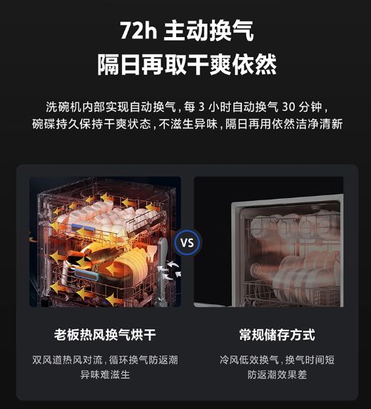 老板WB795X洗碗機(jī)采用了老板電器專(zhuān)利的三叉鯨噴式噴洗技術(shù),噴淋方向更為全面;針對(duì)中式烹飪重油重污的特點(diǎn),通過(guò)三層三叉立體噴洗,能夠無(wú)死角地對(duì)洗碗機(jī)內(nèi)的各種餐具進(jìn)行深度清洗。中式廚具中,鍋具的清理往往是最讓人痛苦的,不但充斥著大量的頑固油漬,還經(jīng)常有干涸的食材粘黏在鍋里,即便是用手清洗,也依舊非常麻煩,老板WB795X洗碗機(jī)作為能洗鍋的洗碗機(jī),通過(guò)其搭載的BLDC變頻電機(jī)能提供40000pa的高壓熱水,能夠快速溶解頑固殘?jiān)?,可?duì)包括蒸鍋、炒鍋、電飯煲內(nèi)膽在內(nèi)的多達(dá)三口鍋具進(jìn)行沖洗,同時(shí)72°高溫的煮洗也能確保對(duì)餐具內(nèi)常見(jiàn)的多種細(xì)菌進(jìn)行消殺,除菌率可高達(dá)99.99%,相當(dāng)于國(guó)家二星級(jí)消毒柜的效果,不僅能夠洗得干凈,還可以消的徹底。 很多家庭,雖然手洗餐具時(shí)洗得非常仔細(xì),卻沒(méi)有對(duì)餐具進(jìn)行擦拭的習(xí)慣,導(dǎo)致細(xì)菌通過(guò)殘留水跡再次附著,針對(duì)這一現(xiàn)象,老板WB795X洗碗機(jī)集烘干存放于一身,通過(guò)雙循環(huán)熱風(fēng)對(duì)機(jī)體內(nèi)部進(jìn)行快速烘干,確保餐具在清洗后迅速恢復(fù)干燥狀態(tài),避免細(xì)菌二次滋生,同時(shí)老板WB795X洗碗機(jī)能夠一次清洗并收納多達(dá)95套餐具,且具有每3小時(shí)自動(dòng)換氣半小時(shí)的功能,鮮存聯(lián)動(dòng),讓收納的餐具能夠及時(shí)通風(fēng),既避免了冷氣凝結(jié)沾染細(xì)菌,又能有效消除異味,讓廚房餐具即取即用,給消費(fèi)者的用餐健康做好最后一道防護(hù)。而且老板洗碗機(jī)尺寸也是比較符合我們對(duì)于節(jié)省空間的理念的。