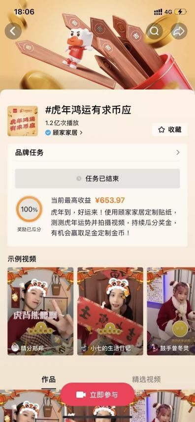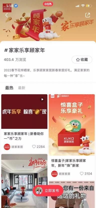 ??金幣領(lǐng)取的方式也非常多元化,“金幣小游戲”、看直播、秀生活、曬愿望等等,年輕人們可以在微信、抖音、小紅書、微博等平臺獲取金幣或其他禮物。 ??其中,顧家家居在抖音發(fā)起全民任務“#虎年鴻運 有求幣應”,話題累計1.2億次播放。在小紅書,話題“家家樂享顧家年”短時間內(nèi)收獲了超過 4494萬次曝光,513.5萬次瀏覽,大批年輕人被吸引而參與其中。