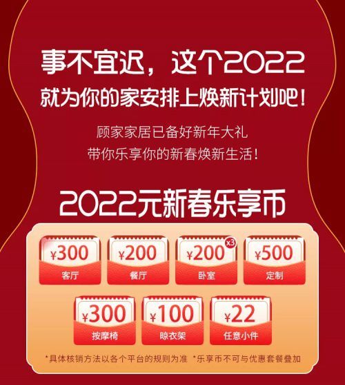 ??其次是有料。 ??此次虎年春節(jié)營銷,顧家家居的“慷慨”不僅僅是送金幣。客廳、餐廳、臥室、定制、按摩椅,乃至晾衣架、家居小件,都包含在春節(jié)大禮包內(nèi),基本滿足了“一站式家居購物”的全部需求。