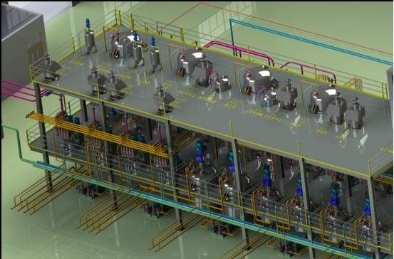??(產(chǎn)線三維模型圖) ??(3D model drawing of production line) ??系統(tǒng)特點(diǎn):System characteristics ??1、粉體投料系統(tǒng)無塵化、自動化,自帶過濾濾芯及除塵系統(tǒng),粉體補(bǔ)料過程中無粉塵飛揚(yáng);粉體根據(jù)配方需求全自動配料;極大的降低人工成本和改善工作環(huán)境; ??The powder feeding system is dust-free and automatic, with its own filter element and dust removal system, and there is no dust flying in the process of powder feeding. The powder is fed automatically according to the formula and greatly reducing labor costs and improving the working environment. ??2、根據(jù)高粘度的物料特性,特殊設(shè)計(jì)混合攪拌結(jié)構(gòu),超高效混合,生產(chǎn)罐及調(diào)色罐真空設(shè)計(jì)壓力為100pa; ??According to the characteristics of high viscosity materials, the mixing structure is specially designed for ultra efficient mixing. The vacuum design pressure of production tank and color mixing tank is 100Pa. ??3、B組分生產(chǎn)罐采用專色專罐,免清洗,無液廢、固廢; ??The production tank of component B uses different tanks for each color, which is free of cleaning and liquid & solid waste. ??4、高效智能,自動化程度高,具備一鍵啟動條件;液體配料及物料轉(zhuǎn)移根據(jù)配方需求全自動運(yùn)行; ??High efficiency, high degree of automation, with one-key start condition.Liquid batching and material conveying are fully automatic operated according to formula. ??5、成品采用恒壓系統(tǒng)泵送至灌裝機(jī),這個輸送過程全部在密閉的管道中進(jìn)行,與全自動灌裝機(jī)聯(lián)動。 ??The finished product is pumped to the filling machine by a constant pressure system. This conveying process is all carried out in a closed pipeline, which is linked with the automatic filling machine. ??目前項(xiàng)目正在安裝進(jìn)行中 ??At present, the project is under installation