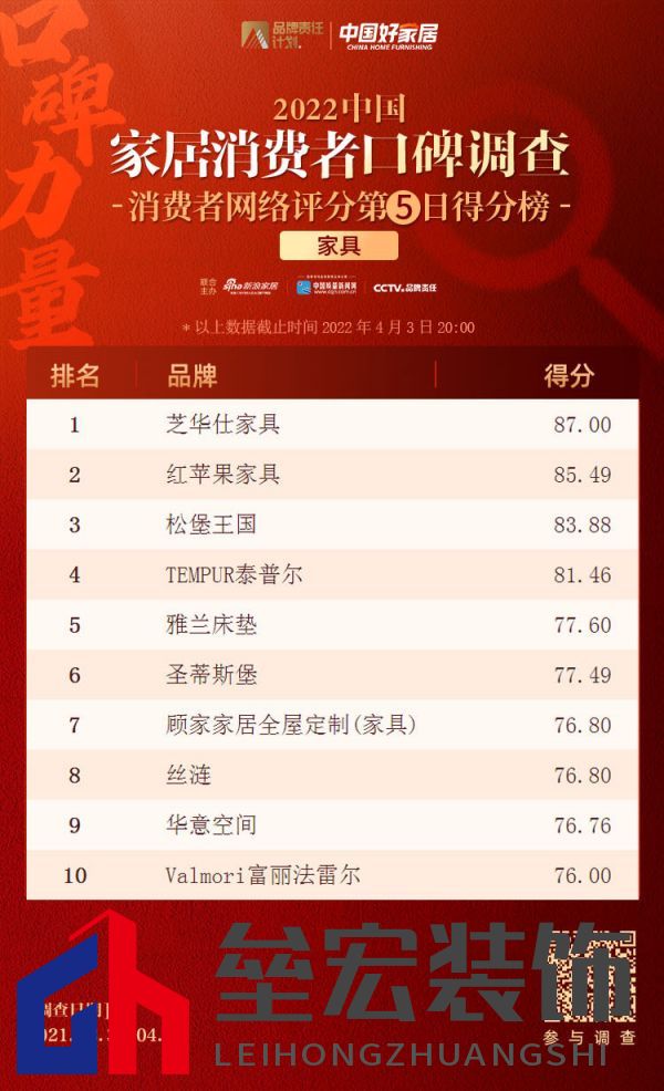 ??其中,位列第1的芝華仕是敏華控股旗下的軟體家具品牌,其“頭等艙沙發(fā)”深為消費(fèi)者熟知。紅蘋果始創(chuàng)于1981年,是具有高端家具品牌、全屋定制服務(wù)商的雙重身份代表企業(yè)。第3名的松堡王國(guó)致力于用愛為孩子打造有趣的成長(zhǎng)空間,從兒童家具到兒童家居生活方式,以安全環(huán)保的產(chǎn)品贏得消費(fèi)者和市場(chǎng)的信任。調(diào)查第5天,家具領(lǐng)域有4個(gè)品牌得分突破了80分大關(guān),其他品牌也一路直追,競(jìng)爭(zhēng)很是激烈。 ??本次活動(dòng)由全國(guó)工商聯(lián)家具裝飾業(yè)協(xié)會(huì)、中國(guó)建筑裝飾協(xié)會(huì)住宅裝飾裝修和部品產(chǎn)業(yè)分會(huì)、中國(guó)室內(nèi)裝飾協(xié)會(huì)、中國(guó)建筑材料流通協(xié)會(huì)、中國(guó)木材與木制品流通協(xié)會(huì)、中國(guó)輕工業(yè)聯(lián)合會(huì)健康家居專業(yè)委員會(huì)6大協(xié)會(huì)全程指導(dǎo),樂居商學(xué)院和家頁(yè)智庫(kù)為本次活動(dòng)提供研究支持。 ??《2022消費(fèi)者口碑調(diào)查》覆蓋家居全品類,通過新浪家居高效分發(fā)系統(tǒng)進(jìn)行全網(wǎng)用戶覆蓋,同期入駐主流賣場(chǎng)線下采集消費(fèi)者調(diào)研樣本。調(diào)查問卷涉及消費(fèi)者對(duì)品牌認(rèn)知、銷售過程評(píng)價(jià)、安裝交付、產(chǎn)品質(zhì)量、售后服務(wù)等6大方面。活動(dòng)結(jié)合專業(yè)評(píng)審研討會(huì)、企業(yè)巡禮等活動(dòng),并根據(jù)調(diào)查結(jié)果,最終于5月發(fā)布“中國(guó)好家居——2022家居消費(fèi)者口碑品牌榜”、《2022中國(guó)家居消費(fèi)藍(lán)皮書》及《2022中國(guó)家居質(zhì)量先鋒志》,以此對(duì)優(yōu)質(zhì)消費(fèi)口碑典型案例及示范企業(yè)進(jìn)行表彰。 ??活動(dòng)全程與消費(fèi)者深度互動(dòng),尊重行業(yè)專家的意見,內(nèi)容觸點(diǎn)下沉到企業(yè)的生產(chǎn)線和實(shí)驗(yàn)室,力求公正、透明、詳實(shí)的向公眾展現(xiàn)參調(diào)品牌的完整風(fēng)貌,用豐富的、具有自傳播價(jià)值的內(nèi)容,呈現(xiàn)出中國(guó)家居人通過“中國(guó)創(chuàng)造”、“中國(guó)質(zhì)量”和“中國(guó)品牌”為美好幸福生活所做出的努力。 |