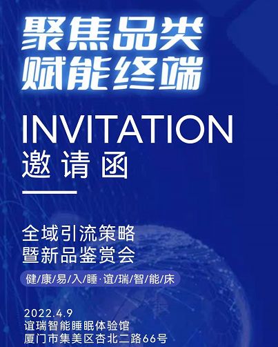 2022年4月9日,誼瑞健康家居將在廈門舉行首屆“聚焦品類,賦能終端”的招商交流會(huì),現(xiàn)場(chǎng)大咖云集,深度解析智能睡眠領(lǐng)域財(cái)富密碼,在全新的市場(chǎng)經(jīng)濟(jì)背景下如何做好線上引流,如何線下門店管理,快速入局大健康產(chǎn)業(yè)。