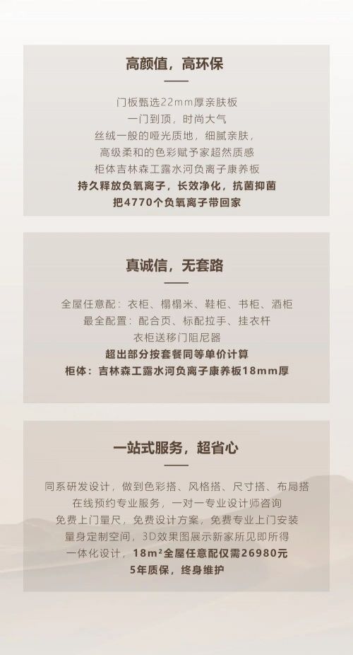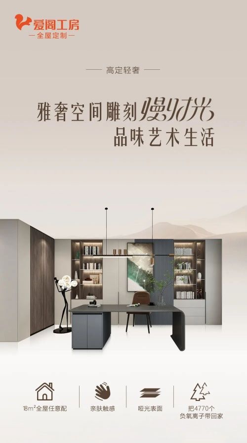 | 愛閣工房全屋定制成立于2003年,是一家集研發(fā)、設(shè)計、生產(chǎn)、 銷售、服務(wù)為一體的全屋定制家居企業(yè)。多年來,企業(yè)一直堅持綠色環(huán)保路線的探索,嚴(yán)選健康環(huán)保板材,引進吉林森工露水河負(fù)離子康養(yǎng)板。該板材具有持久釋放負(fù)氧離子、凈化空氣,抗菌抑菌等健康環(huán)保的特性,為萬千家庭營造了環(huán)保健康的家居環(huán)境,真正做到即裝即享,負(fù)離子空間。 為回饋愛閣工房眾多客戶的支持,愛閣工房推出新品高定輕奢套餐,18m2定制滿足5大空間需求,衣柜、書柜、鞋柜、榻榻米、酒柜全屋任意配,僅需26980元,把4770個負(fù)氧離子帶回家,享受慢生活帶來的愜意。