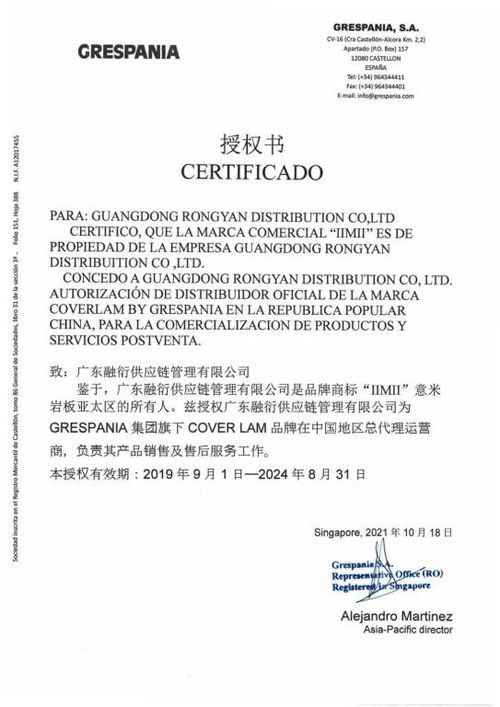 意米巖板,歐洲原裝進口,世界潮流同步。自2019年攜手GRESPANIA集團以來,步履不停,開拓不止,在強調產品品質與格調的同時,更注重于健康家居的生活理念,并把品牌的遠見卓識與責任擔當作為我們重要的使命。 戰(zhàn)略授權書