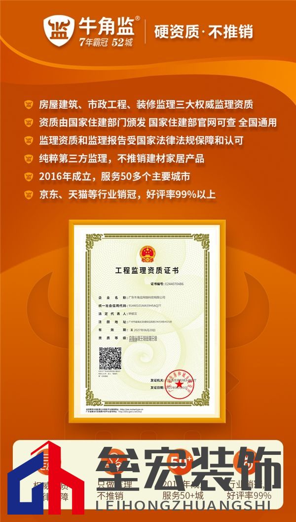 7年完美蝶變。牛角監(jiān)已然踏上了一個全新的臺階,從一個“只做監(jiān)理不推銷”理念,到獲得1000萬天使投資企業(yè)落地,再到裝修監(jiān)理行業(yè)的霸冠者,牛角監(jiān)完成了完美蝶變。 7年來,牛角監(jiān)在廣州、深圳、上海、杭州、蘇州、成都、佛山成立了7家直營公司,在全國30多個省會等重要城市成立了加盟公司,服務(wù)范圍覆蓋了全國50多個城市和地區(qū)。牛角監(jiān)成為了全國裝修監(jiān)理行業(yè)服務(wù)范圍最廣的企業(yè)。牛角監(jiān)還是全國主要平臺如天貓、京東、大眾點(diǎn)評等的常年行業(yè)銷售冠軍,在各大平臺上好評如潮,好評率達(dá)99%以上。 02、7歲牛角監(jiān)厚積薄發(fā),再獲硬資質(zhì)