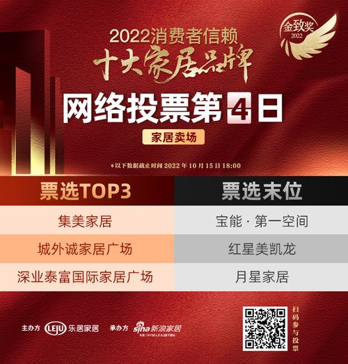 | 由樂居家居主辦,新浪家居承辦;CCTV《大國品牌》、家頁、家居質(zhì)量研究院、大國中居聯(lián)合主辦;全國工商聯(lián)家具裝飾業(yè)商會、中國建筑材料流通協(xié)會共同指導;樂騰商學院、家頁智庫、家居質(zhì)量研究院提供研究支持。9月16日,第三屆《尋找優(yōu)質(zhì)消費者品牌--2022消費者信賴十大家居品牌》正式啟動。經(jīng)過企業(yè)申報、候選品牌公示環(huán)節(jié)后,于10月12日正式進入投票環(huán)節(jié)。>>點擊為家居賣場品牌投票 家居賣場第四日戰(zhàn)報如下