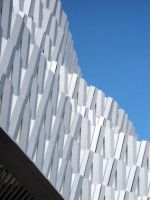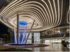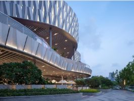 珠海環(huán)宇城的外立面以多層次的波浪紋呼應海洋主題 裙樓設(shè)計以海洋作為靈感,與帆船形態(tài)的塔樓設(shè)計相呼應。波紋折板、浪花型的穿孔鋁板等飾面配合簡潔流暢的線條突出現(xiàn)代輕奢感。入口以海浪元素為設(shè)計靈感,臨河一面的圓弧形線條宛如層層疊疊的波紋,加上造型各異的頂棚,讓人有種踏入海浪的互動感。夜幕降臨后,在燈光的烘托下,人們仿佛沉浸于寧靜而斑斕的海洋世界。