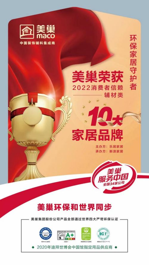 ??“2022消費(fèi)者信賴十大家居品牌”評(píng)選活動(dòng)由樂(lè)居家居主辦,新浪家居承辦,CCTV《大國(guó)品牌》、家頁(yè)、家居質(zhì)量研究院、大國(guó)中居聯(lián)合主辦。本次評(píng)選活動(dòng)以“家居行業(yè)高質(zhì)量發(fā)展,扎實(shí)推進(jìn)優(yōu)質(zhì)品牌建設(shè)”為宗旨,通過(guò)對(duì)產(chǎn)品品質(zhì)、服務(wù)質(zhì)量、消費(fèi)口碑、品牌影響力四大維度綜合評(píng)審。美巢憑借世界水平的環(huán)保產(chǎn)品、美巢服務(wù)中國(guó)的市場(chǎng)布局、良好的消費(fèi)者口碑及深耕多年的品牌影響力榮登“2022消費(fèi)者信賴十大家居品牌”輔材類榜單。 ??環(huán)保家居守護(hù)者,美巢環(huán)保和世界同步 ??作為消費(fèi)者信賴十大家居品牌,美巢成立26年以來(lái)始終專注、專業(yè)于室內(nèi)環(huán)保裝飾輔料的研究、開(kāi)發(fā)和制造。室內(nèi)裝飾與生命零距離,美巢有責(zé)任給消費(fèi)者一個(gè)鄭重承諾——“美巢環(huán)保和世界同步”。美巢集團(tuán)股份公司產(chǎn)品全部通過(guò)了世界四大環(huán)保認(rèn)證:美國(guó)UL GREENGUARD綠色衛(wèi)士[金級(jí)]認(rèn)證、德國(guó)GEV EMICODE EC1PLUS認(rèn)證、歐洲歐陸IAC金級(jí)認(rèn)證、法國(guó)French A+級(jí)標(biāo)準(zhǔn)。憑借著世界水平的環(huán)保產(chǎn)品被授牌成為2020年迪拜世博會(huì)中國(guó)館指定用品供應(yīng)商。