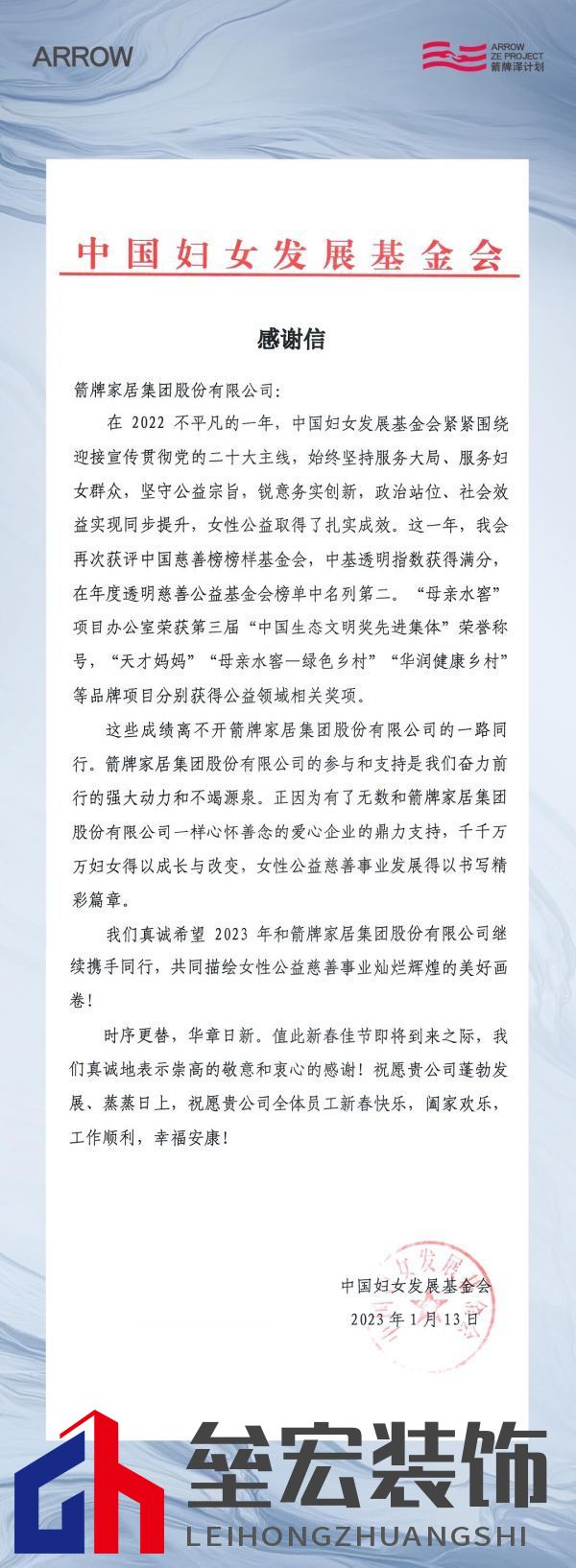 | 踐行社會責任,打造「箭牌澤計劃」回饋社會 據(jù)世界氣象組織在2022年底發(fā)布的首份《全球水資源狀況報告》,目前全球有36億人每年至少有一個月面臨供水不足,預計到2050年這一數(shù)字還將增至50億以上。 當影響國計民生、關乎人類生存發(fā)展的水資源問題愈加嚴峻,越來越多來自社會各界的群體、組織開始投身其中,探尋解決之道,逐漸凝成了獨特的公益力量。而箭牌家居集團打造的公益品牌-「箭牌澤計劃」正是以回饋社會為己任,努力踐行社會責任。  誕生自2022年的「箭牌澤計劃」延續(xù)了箭牌家居的基因,通過創(chuàng)新化的探索,挖掘出品牌公益道路的新模式:以衛(wèi)生和環(huán)保為抓手,凝聚各方細水長流的公益力量,以產(chǎn)品、活動、資金等多種形式將關愛輻射至多個群體,并配合品牌科技驅(qū)動打造“可持續(xù)的生活解決方案”。這其中便涵蓋對“水”公益的落地行動。 秉承著讓水資源短缺地區(qū)的孩子也可以實現(xiàn)熱水澡自由的信念,2022年8月,箭牌家居聯(lián)合廣東省婦女兒童基金會,以現(xiàn)金捐贈的形式助力內(nèi)蒙古正藍旗那日圖蘇木烏日圖嘎查“母親水窖——集中供水工程”援建項目,幫助偏遠干旱地區(qū)婦女和群眾解決飲水困難的問題,在整個過程中倡導全社會踐行節(jié)水行為、實現(xiàn)更為環(huán)保的生活方式,內(nèi)蒙古“母親水窖”項目成為中國缺水地區(qū)萬千家庭生活的希望與幸福源泉。 在傳遞善意的道路上,點滴付出亦會被看見。近日,箭牌家居「箭牌澤計劃」對“母親水窖——集中供水工程”援建項目的公益行動收到了中國婦女發(fā)展基金會的感恩回饋。一封誠摯的感謝信,道盡中國婦女發(fā)展基金會與箭牌家居戮力同心、持續(xù)發(fā)力女性公益事業(yè)的初心。  用品牌力量發(fā)起公益號召,做有溫度有擔當?shù)钠髽I(yè) 事實上,箭牌家居一直走在社會公益的道路上,踐行著企業(yè)應有的社會責任。2021年-2022年期間,箭牌家居曾聯(lián)合香江社會救助基金會,援建重點貧困地區(qū)學校,陸續(xù)為湖南、廣東內(nèi)十所在建小學捐贈衛(wèi)生間瓷磚、坐便器、蹲便器、立柱盆、龍頭等潔具產(chǎn)品,幫助當?shù)馗纳平逃h(huán)境,提升相關衛(wèi)生體驗標準和兒童衛(wèi)生常識;還攜手廣東省婦女兒童基金會,聚焦對特殊母親及其家庭的關懷和扶持,為50個特殊家庭提供潔具產(chǎn)品,幫助特殊家庭解決健康生活的難題;此外,2022年年末,箭牌家居更是將公益的核心聚焦老年人群體,聯(lián)合天貓、中國老年學會和老年醫(yī)學學會共同發(fā)起“黃扶手計劃”,向社會送出5萬個適老扶手,為老年人群體送去精神和生活的支柱。  于無聲處傳遞愛意,于細節(jié)處貼心守護。相信未來,箭牌家居將持續(xù)公益之路,通過「箭牌澤計劃」讓善意觸達更廣泛的群體,用品牌的力量發(fā)起全社會的公益號召,做有溫度有擔當?shù)钠髽I(yè)。