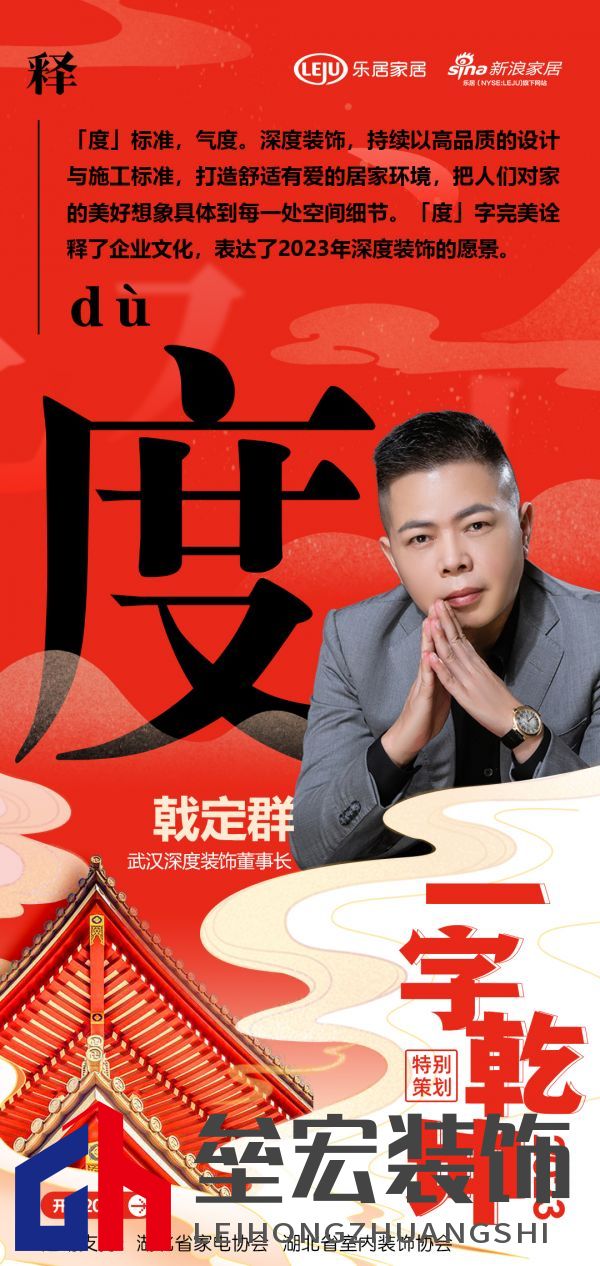 在新浪家居“2023一字乾坤”活動(dòng)中,深度裝飾董事長(zhǎng)戟定群:「度」標(biāo)準(zhǔn),氣度。深度裝飾,持續(xù)以高品質(zhì)的設(shè)計(jì)與施工標(biāo)準(zhǔn),打造舒適有愛(ài)的居家環(huán)境,把人們對(duì)家的美好想象具體到每一處空間細(xì)節(jié)。「度」字完美詮釋了企業(yè)文化,表達(dá)了2023年深度裝飾的愿景。 “以漢字賦能湖北家居企業(yè),彰顯厚積薄發(fā)之力”,以單字抒寫(xiě)了各家企業(yè)及媒體的新年愿景與發(fā)展信條,領(lǐng)略楚風(fēng)漢韻下湖北家居人砥礪向前,揚(yáng)帆未來(lái)的決心與動(dòng)力,情暖兔歲,新啟華章。 |