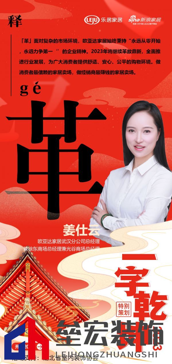 在新浪家居“2023一字乾坤”活動中,歐亞達家居武漢分公司總經理兼徐東商場總經理兼光谷商場總經理姜仕云:「革」去故也。鼎,取新也。面對復雜的市場環(huán)境,歐亞達家居始終秉持“永遠從零開始,永遠力爭第一”的企業(yè)精神。2023年將繼續(xù)革故鼎新,全面推進行業(yè)發(fā)展,為廣大消費者提供舒適、安心、公平的購物環(huán)境。做消費者最信賴的家居賣場,做經銷商最賺錢的家居賣場。 “以漢字賦能湖北家居企業(yè),彰顯厚積薄發(fā)之力”,以單字抒寫了各家企業(yè)及媒體的新年愿景與發(fā)展信條,領略楚風漢韻下湖北家居人砥礪向前,揚帆未來的決心與動力,情暖兔歲,新啟華章。 |