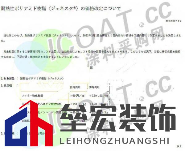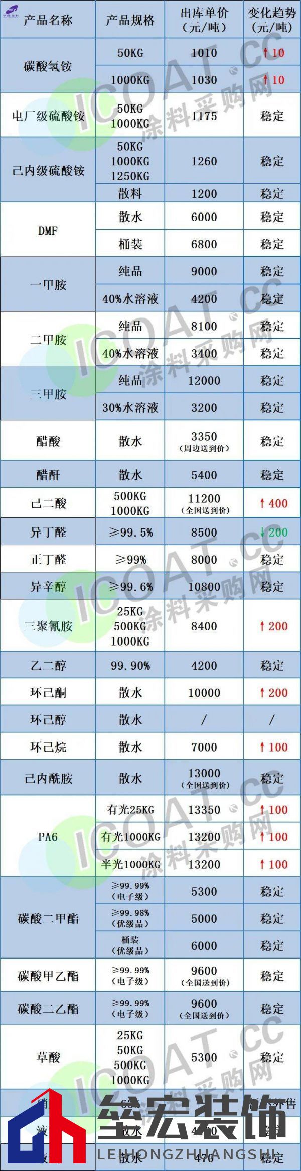 (上海華誼新材料1月29日產(chǎn)品報(bào)價(jià)表) 華魯恒升己二酸掛牌價(jià)調(diào)漲400元,報(bào)11200元/噸送到。 石家莊柏坡正元液氨調(diào)漲30元,報(bào)4250元/噸。 利華益維遠(yuǎn)化學(xué)苯酚產(chǎn)品出廠價(jià)格上調(diào)100元/噸,執(zhí)行7800元/噸。 大連恒力丁二烯價(jià)格上調(diào)200元/噸至8710元/噸。 神華寧煤丁二烯價(jià)格上調(diào)300元/噸至8400元/噸。 山東地區(qū)醋酸企業(yè)周邊送到價(jià)在3050元/噸左右,假期市場(chǎng)價(jià)格上調(diào)100元/噸。 利華益異辛醇價(jià)格上漲500元/噸,報(bào)10400元/噸。 華魯恒升異辛醇價(jià)格上漲500元/噸,報(bào)10800元/噸。 利華益維遠(yuǎn)化學(xué)丙酮產(chǎn)品出廠價(jià)格上調(diào)200元/噸執(zhí)行5200元/噸。 上海巴斯夫TDI 1月結(jié)算價(jià)19300元/噸,2月掛牌25000元/噸,環(huán)比上調(diào)4000/噸。 可樂麗株式會(huì)社發(fā)布調(diào)價(jià)通知,自2023年2月1日起,填料強(qiáng)化品種和玻璃纖維強(qiáng)化鹵素阻燃品種國(guó)內(nèi)漲60日元/kg,國(guó)外市場(chǎng)漲0.5美元/kg(約合人民幣3392元/噸);玻璃纖維強(qiáng)化鹵素阻燃品種國(guó)內(nèi)漲150日元/kg,國(guó)外市場(chǎng)漲1.2美元/kg(約合人民幣8184元/噸);LED品種國(guó)內(nèi)漲300日元/kg,國(guó)外市場(chǎng)漲2.3美元/kg(約合人民幣15604元/噸)。  信息來源:涂料采購網(wǎng) 封面圖:立邦官網(wǎng) |