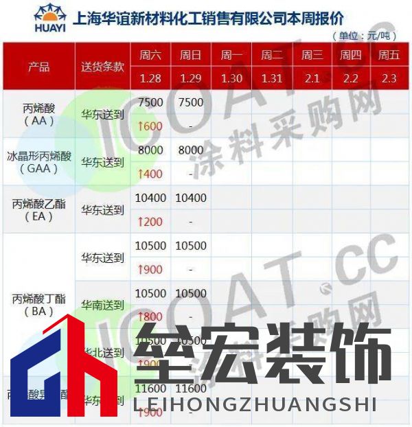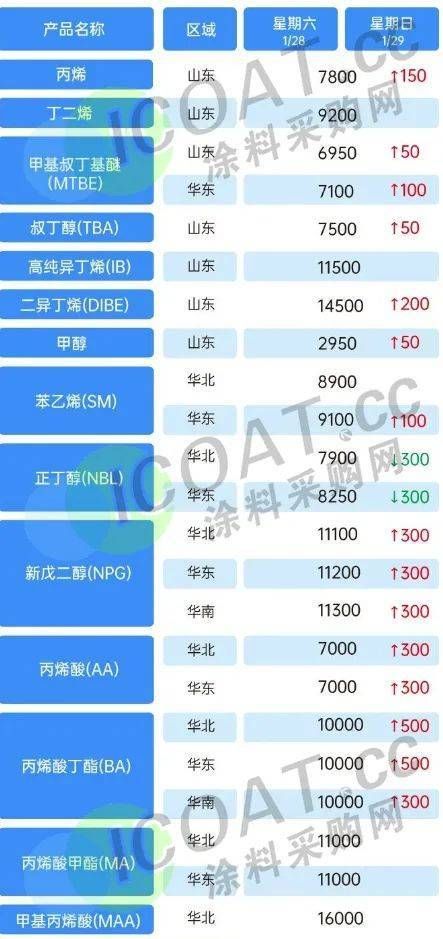 (萬華化學(xué)1月29日產(chǎn)品報(bào)價(jià)表) 上海華誼新材料價(jià)格表顯示,與年初價(jià)格相比,丙烯酸上漲600元/噸,冰晶形丙烯酸上漲400元/噸,丙烯酸乙酯上漲200元/噸,丙烯酸丁酯上漲900元/噸,丙烯酸異丁酯上漲900元/噸。