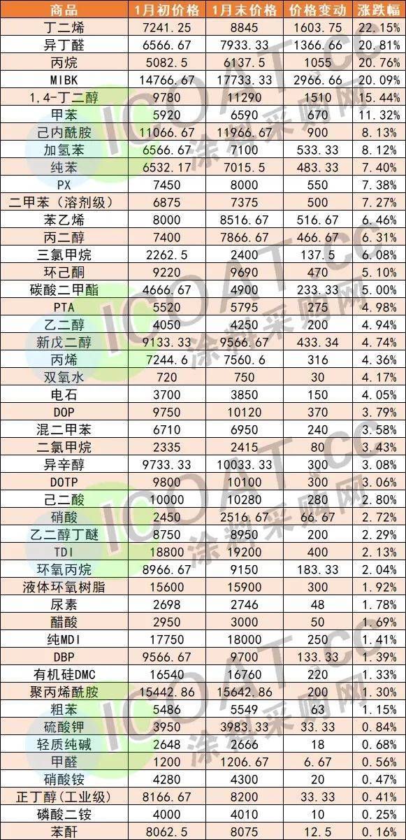 (華魯恒升1月29日產(chǎn)品報(bào)價(jià)表) 萬華化學(xué)報(bào)價(jià)表顯示,與年初價(jià)格相比,丙烯上漲400元/噸,丁二烯上漲1400元/噸,MTBE上漲300元/噸,叔丁醇上漲200元/噸,二異丁烯上漲300元/噸,苯乙烯上漲500元/噸,新戊二醇上漲1000元/噸,丙烯酸上漲300元/噸,丙烯酸丁酯上漲1000元/噸。