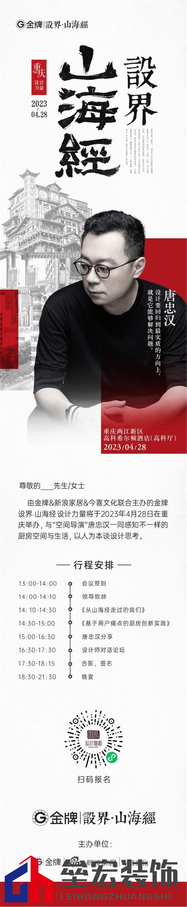 ??唐忠漢 ??近境制作創(chuàng)始人·設(shè)計總監(jiān) ??中國室內(nèi)設(shè)計十大年度人物 ??中國空間陳設(shè)行業(yè)領(lǐng)軍人物 ??安邸AD100中國最具影響力100位設(shè)計精英 ??Andrew Martin國際設(shè)計大獎得主 ??意大利A‘ design鉑金獎得主 ??北京清華大學軟裝研修班講師 ??深圳市創(chuàng)想公益基金會專家顧問 ??2023年4月28日,唐忠漢將重磅蒞臨金牌《設(shè)界·山海經(jīng)》設(shè)計力量的重慶活動現(xiàn)場,帶來主題分享,與新銳設(shè)計力量現(xiàn)場解讀其設(shè)計實踐中的美學邏輯,探尋如何打造高品質(zhì)的理想居住空間! ??與此同時,《設(shè)界·山海經(jīng)》重慶活動還將精彩上演多重環(huán)節(jié),設(shè)界·山海經(jīng)發(fā)起人、金牌廚柜品牌總監(jiān)劉興奮先生應(yīng)邀發(fā)表《從山海經(jīng)走過的我們》主題講話,金牌廚柜研發(fā)總監(jiān)助理周耘先生帶來《基于用戶痛點的廚房創(chuàng)新實踐》的新品分享,講述金牌的品牌文化與設(shè)計理念。而在設(shè)計師對話論壇,《設(shè)界·山海經(jīng)》活動將與新設(shè)計青年強強對話,從文化、美學、產(chǎn)品工業(yè)等多個維度,討論新趨勢、新審美、新思潮,設(shè)計如何讓生活更美好,更貼近生活以及如何同時具有美學價值。