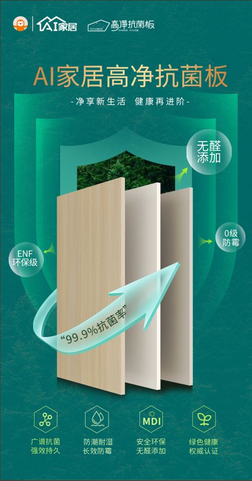??AI家居高凈抗菌板,作為集“無醛添加、抗菌、防霉”三重守護力于一體的環(huán)保板材,是品牌為廣大消費者打造健康整家新防線,積極推進國家兒童友好空間體系建設的拳頭產(chǎn)品。從原材料的選取、基材成型,到裁板切割、封邊貼面,生產(chǎn)過程不添加甲醛物質,真正實現(xiàn)無甲醛添加。