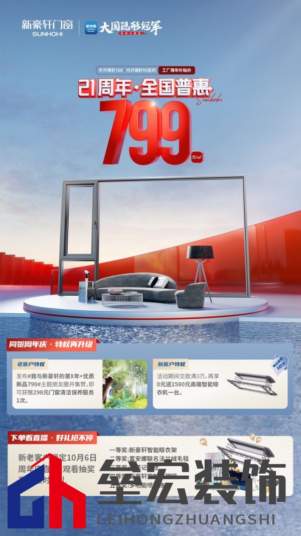 新豪軒21周年慶期間 不僅有799元鉅惠好窗亮相 更有新老客戶專屬福利放送 歡迎前往新豪軒門(mén)店咨詢 并鎖定10月6日周年慶直播 下單搶好窗 抽獎(jiǎng)贏大禮