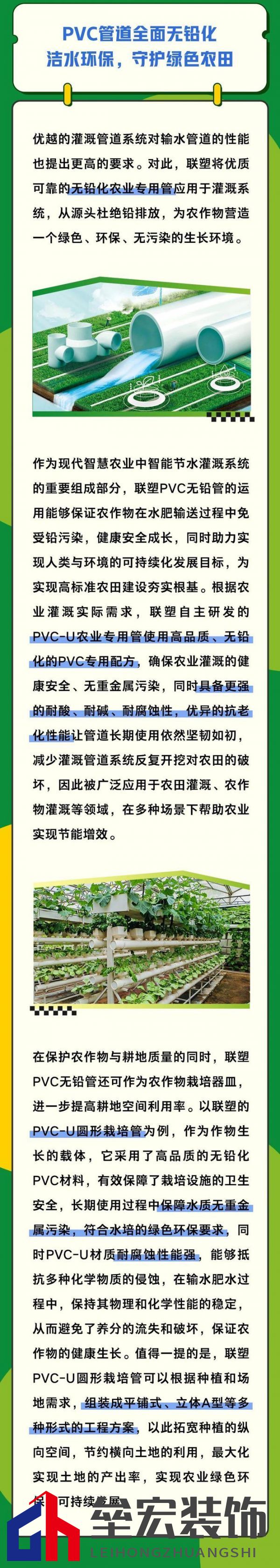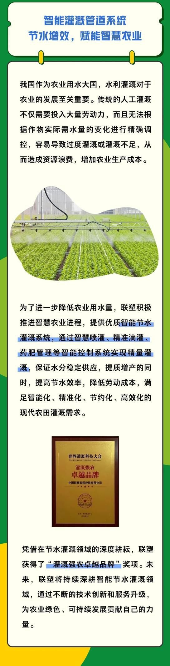 憑借在節(jié)水灌溉領(lǐng)域的深度耕耘,聯(lián)塑獲得了“灌溉強農(nóng)卓越品牌”獎項。未來,聯(lián)塑將持續(xù)深耕智能節(jié)水灌溉領(lǐng)域,通過不斷的技術(shù)創(chuàng)新和服務(wù)升級為農(nóng)業(yè)綠色、可持續(xù)發(fā)展貢獻自己的力量。 潔水環(huán)保,守護綠色農(nóng)田 優(yōu)越的灌溉管道系統(tǒng)對輸水管道的性能也提出更高的要求。對此,聯(lián)塑將優(yōu)質(zhì)可靠的無鉛化農(nóng)業(yè)專用管應(yīng)用于灌溉系統(tǒng),從源頭杜絕鉛排放,為農(nóng)作物營造一個綠色、環(huán)保、無污染的生長環(huán)境。 作為現(xiàn)代智慧農(nóng)業(yè)中智能節(jié)水灌溉系統(tǒng)的重要組成部分,聯(lián)塑PVC無鉛管的運用能夠保證農(nóng)作物在水肥輸送過程中免受鉛污染,健康安全成長,同時助力實現(xiàn)人類與環(huán)境的可持續(xù)化發(fā)展目標(biāo),為實現(xiàn)高標(biāo)準(zhǔn)農(nóng)田建設(shè)夯實根基。根據(jù)農(nóng)業(yè)灌溉實際需求,聯(lián)塑自主研發(fā)的PVC-U農(nóng)業(yè)專用管使用高品質(zhì)、無鉛化的PVC專用配方,確保農(nóng)業(yè)灌溉的健康安全、無重金屬污染,同時具備更強的耐酸、耐堿、耐腐蝕性,優(yōu)異的抗老化性能讓管道長期使用依然堅韌如初減少灌溉管道系統(tǒng)反復(fù)開挖對農(nóng)田的破壞,因此被廣泛應(yīng)用于農(nóng)田灌溉、農(nóng)作物灌溉等領(lǐng)域,在多種場景下幫助農(nóng)業(yè)實現(xiàn)節(jié)能增效。