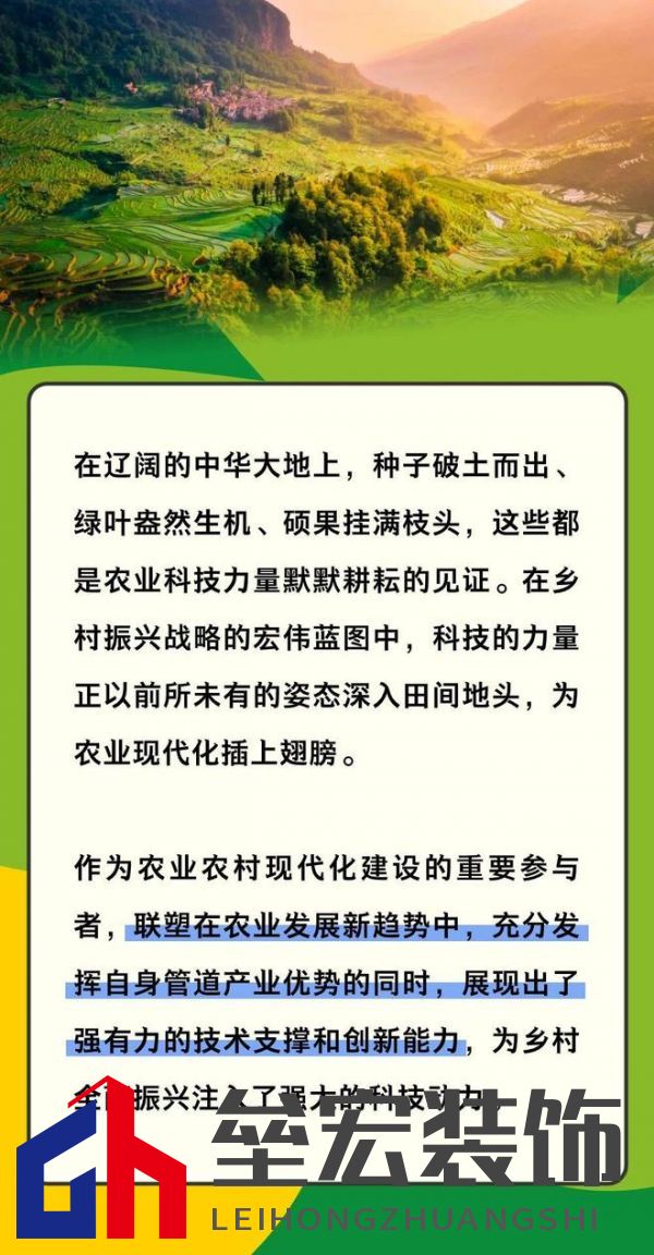 | 在遼闊的中華大地上,種子破土而出、綠葉盎然生機、碩果掛滿枝頭,這些都是農(nóng)業(yè)科技力量默默耕耘的見證。在鄉(xiāng)村振興戰(zhàn)略的宏偉藍圖中,科技的力量正以前所未有的姿態(tài)深入田間地頭,為農(nóng)業(yè)現(xiàn)代化插上翅膀。 作為農(nóng)業(yè)農(nóng)村現(xiàn)代化建設(shè)的重要參與者,聯(lián)塑在農(nóng)業(yè)發(fā)展新趨勢中,充分發(fā)揮自身管道產(chǎn)業(yè)優(yōu)勢的同時,展現(xiàn)出了強有力的技術(shù)支撐和創(chuàng)新能力,為鄉(xiāng)村全面振興注入了強大的科技動力。