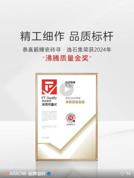 ??箭牌瓷磚的每一份榮譽背后,都是對品質(zhì)的不將就。 ??未來,箭牌瓷磚將載譽前行,持質(zhì)以恒,不斷提升消費者的生活品質(zhì)體驗,推動行業(yè)高質(zhì)量發(fā)展。 |