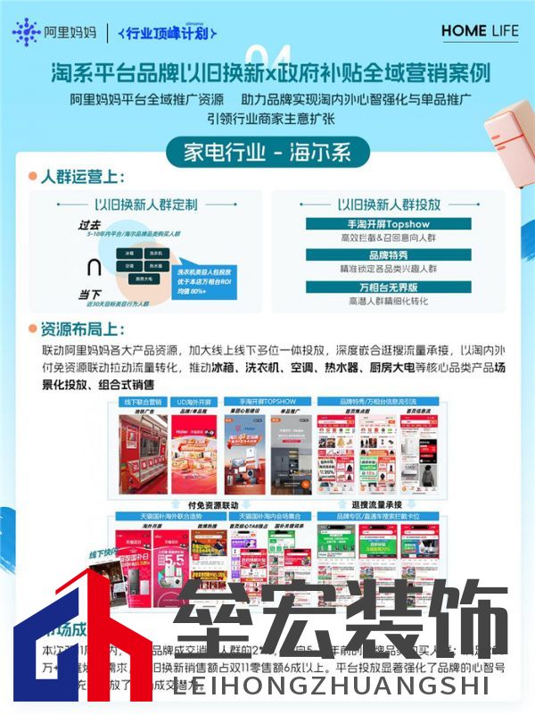 ??領(lǐng)跑案例剖析 ??海爾: ??依托平臺產(chǎn)品資源:手淘開屏Topshow(高效攔截&召回意向人群)+品牌特秀(精準鎖定各品類興趣人群)+萬相臺無界版(高潛人群精細化轉(zhuǎn)化) ??線上線下多位一體投放,深度嵌合逛搜流量承接,以淘內(nèi)外付免資源聯(lián)動拉動流量轉(zhuǎn)化,冰箱、洗衣機、空調(diào)、熱水器、廚房大電等核心品類產(chǎn)品場景化投放、組合式銷售,本次雙11周期內(nèi)成交人群2*%來自5-10年前的品牌品類購買人群。