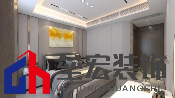 ??主臥室床頭為墻板背景墻,鈦金條點(diǎn)綴,莊重典雅,頂面為無(wú)主燈懸浮吊頂,既可以滿足中央空調(diào)的安裝,中間也不顯空曠。