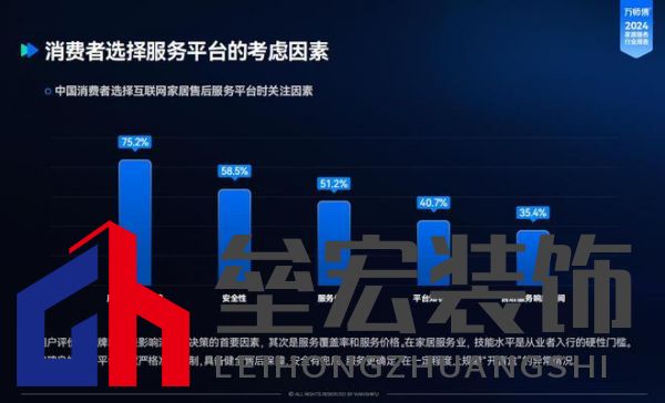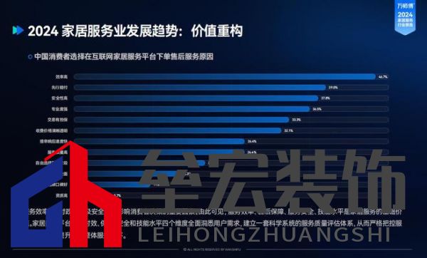 報(bào)告顯示,效率高、先行賠付、安全性高、專業(yè)性強(qiáng)是中國(guó)消費(fèi)者選擇線上下單家居服務(wù)的主要原因。而用戶評(píng)價(jià)及品牌口碑是用戶選擇平臺(tái)的重要決策要素,其次是服務(wù)覆蓋率和服務(wù)價(jià)格。