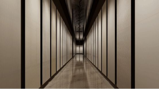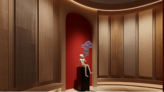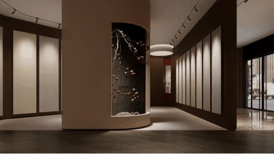 弧形選材區(qū)以立柱為中心,采用發(fā)散式弧形布局打破傳統(tǒng)展示邊界。鏡面天花與流暢的展線設(shè)計(jì)形成視覺延伸,讓空間在虛實(shí)交錯中倍增開闊感。