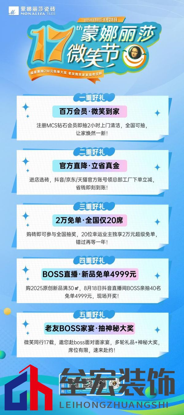 ??為真誠回饋廣大用戶的信賴,今年針對2025原創(chuàng)新品——「時空石韻」與「無極石界」的優(yōu)惠力度進行了重磅升級,凡用戶購買上述新品對應規(guī)格瓷磚面積達30㎡及以上,即可有機會抽取4999元免單大獎,鎖定8月18日,蒙娜麗莎瓷磚抖音官方直播間將迎來神秘BOSS空降,這場專屬直播將會揭曉免單名額! 微笑力量,從品質交付到情感聯(lián)結??承載著對”美好家“與健康生活的執(zhí)著追求,更為了回饋萬千用戶的信任與期待,蒙娜麗莎微笑節(jié)已在全國范圍200多個城市,超3000家線下門店展開,同步打通天貓、京東、抖音直播間等線上渠道,形成了全覆蓋渠道的系列主題活動。 ??今年8月8日,這場持續(xù)的溫暖承諾將再度兌現(xiàn)。第十七屆蒙娜麗莎微笑節(jié)即將盛大啟幕,其中,最令人期待的”BOSS微笑家宴“,是品牌誠意與溫度的集中體現(xiàn),用戶將獲得與老板面對面交流的機會,暢談使用蒙娜麗莎瓷磚的真實體驗與生活故事。?現(xiàn)場還將精心準備多輪禮品福利,更有機會抽取驚喜大獎,這不僅是一場傾聽用戶心聲的對話,更是一次拉近品牌與用戶距離的情感交融。