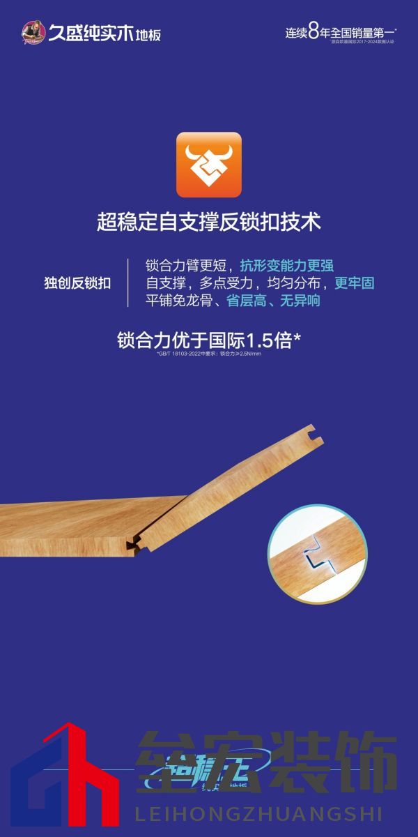 ??②超穩(wěn)定自支撐反鎖扣技術(shù): ??獨創(chuàng)反鎖扣結(jié)構(gòu),自支撐,多點受力,力度分布更均勻,著力點向上,支撐更牢固;無需使用龍骨、打釘、施膠粘結(jié)等其它輔助材料,大規(guī)格地板也穩(wěn)定,鎖合力優(yōu)于國標(biāo)1.5倍,為純實木地板平鋪戴上了“雙保險”。