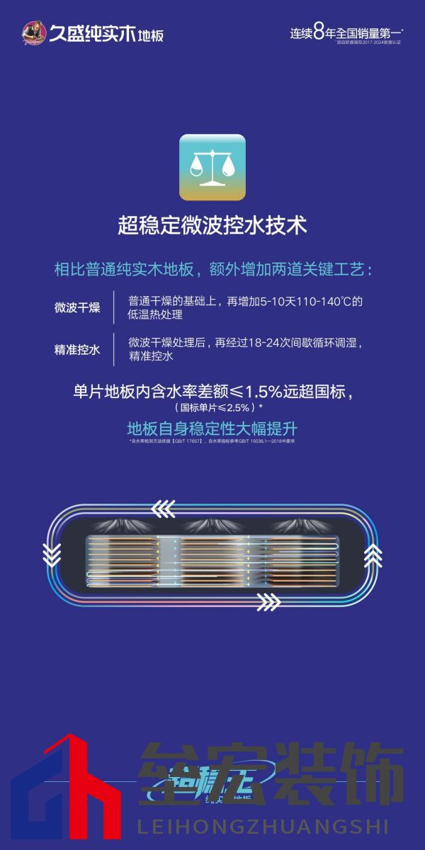 ??創(chuàng)新技術(shù)組合拳 ??①超穩(wěn)定微波控水技術(shù): ??比普通純實木地板額外增加10天以上的“微波干燥”和“精準(zhǔn)控水”2道關(guān)鍵工藝,地板自身穩(wěn)定性大幅提升,木材含水率更均勻,單片內(nèi)差額≤1.5%遠(yuǎn)優(yōu)國標(biāo)(國標(biāo)單片≤2.5%)。