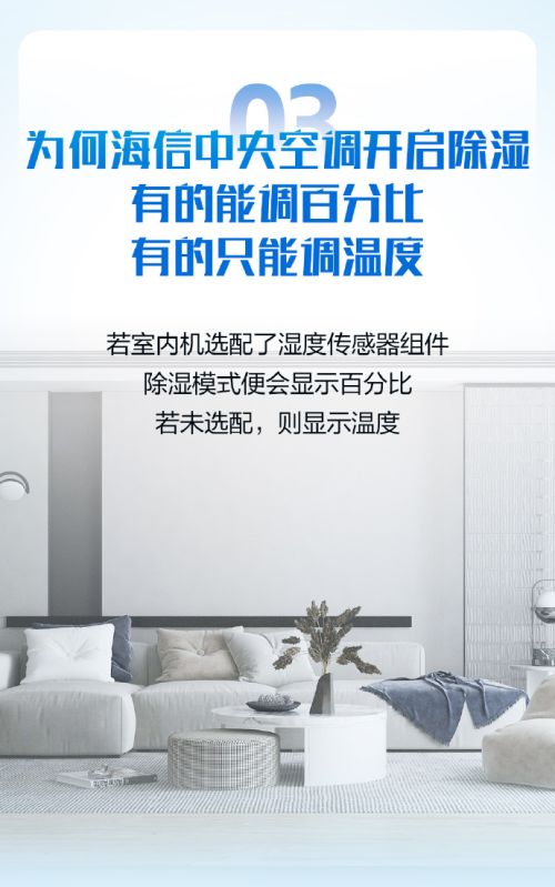 ??三、為何海信中央空調(diào)開啟除濕,有的能調(diào)百分比,有的只能調(diào)溫度 ??若室內(nèi)機選配了濕度傳感器組件,除濕模式便會顯示百分比。若未選配,則顯示溫度。