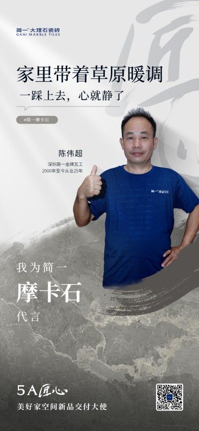 ??從湛江吳川的磚瓦聲到深圳高端住宅的工地上,陳偉超彎腰的姿勢(shì),重復(fù)了25年。2000年入行至今,二十五年的光陰淬煉出他手中“切磚如原片”的絕技。作為5A匠心?美好家空間新品交付大使,他帶著“摩卡石”登場(chǎng),用刀鋒般的精準(zhǔn)詮釋空間的詩意——每一道切割線,都是對(duì)原始肌理的虔誠致敬。 ??25年“磨細(xì)”功:把“切口”磨成“原樣” ??在陳偉超的字典里,“細(xì)致”從來不是抽象的詞。在簡(jiǎn)一的4年里,他最自豪的是切出的磚片差不多跟那個(gè)原磚片一樣。比對(duì)紋理走向時(shí),他會(huì)蹲在地上半天不動(dòng),直到確認(rèn)每一刀都順著紋路的自然弧度;調(diào)整角度時(shí),指尖貼著磚邊一點(diǎn)點(diǎn)挪,確保切口平整得能和另一塊嚴(yán)絲合縫。這種較真,讓他切出的磚的縫隙,總能在墻面、地面的轉(zhuǎn)角處“隱形”,仿佛本就該長(zhǎng)在那里。