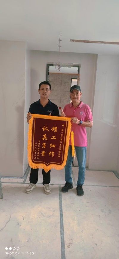 ??盛夏的工地沒有空調(diào),汗水順著額角淌進(jìn)眼睛里,他抹把臉繼續(xù)校準(zhǔn)瓷磚,手指不停在磚邊比畫,就怕一刀下去破壞了紋路的流暢;寒冬的風(fēng)裹著冷氣往骨頭里鉆,指尖凍得發(fā)僵,他就往手心哈口熱氣搓搓,再繼續(xù)貼著磚邊找角度,哪怕膝蓋抵著冰冷的地面麻了半邊腿,也得等確認(rèn)切口和原磚嚴(yán)絲合縫才肯起身。 ??這些藏在寒暑里的堅(jiān)持,讓他通過手里的磚片,把“切磚如原磚”的細(xì)致,刻進(jìn)了深圳深鐵懿府、臨海攬山、香蜜湖熙園這些深圳高端住宅的角落里。而這樣的細(xì)致,陪著他鋪妥了300多個(gè)家的瓷磚,從未打折扣。 ??簡(jiǎn)一5A空間交付:只為那份妥帖和心安 ??有人問他:“干這么多年,哪一刻最有成就感?”陳偉超笑了:“前陣子在香蜜湖別墅,業(yè)主看完非常滿意,當(dāng)場(chǎng)說‘這項(xiàng)目的其他地方也給你們做’?!?/p> ??這份信任,源于他對(duì)工藝精度的執(zhí)著打磨,簡(jiǎn)一今年全新升級(jí)「5A精工薄貼」工藝后,他貼的磚縫能控制在0.2毫米以內(nèi)——比半根頭發(fā)絲還細(xì),站在遠(yuǎn)處看,墻/地面像一整塊渾然天成的石材,紋理順著墻/地面自然延伸,業(yè)主驗(yàn)收時(shí)湊近了才發(fā)現(xiàn)“原來有縫”。 ??這一面面由業(yè)主親手送上的錦旗,便是對(duì)陳偉超匠心最生動(dòng)的認(rèn)證:深圳星河丹堤李小姐送來的“手藝精湛 完美呈現(xiàn) 服務(wù)周到 盡心盡責(zé)”,16個(gè)金光大字里,仿佛能看見他為調(diào)順一道紋理,蹲在地上半天不動(dòng)直到腿麻的執(zhí)著,也能想起他一次次停下手中活計(jì),耐心解答業(yè)主疑問時(shí)眼里的真誠;